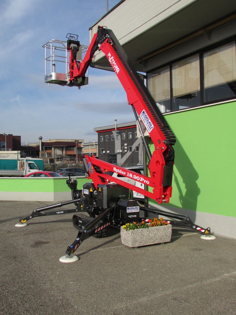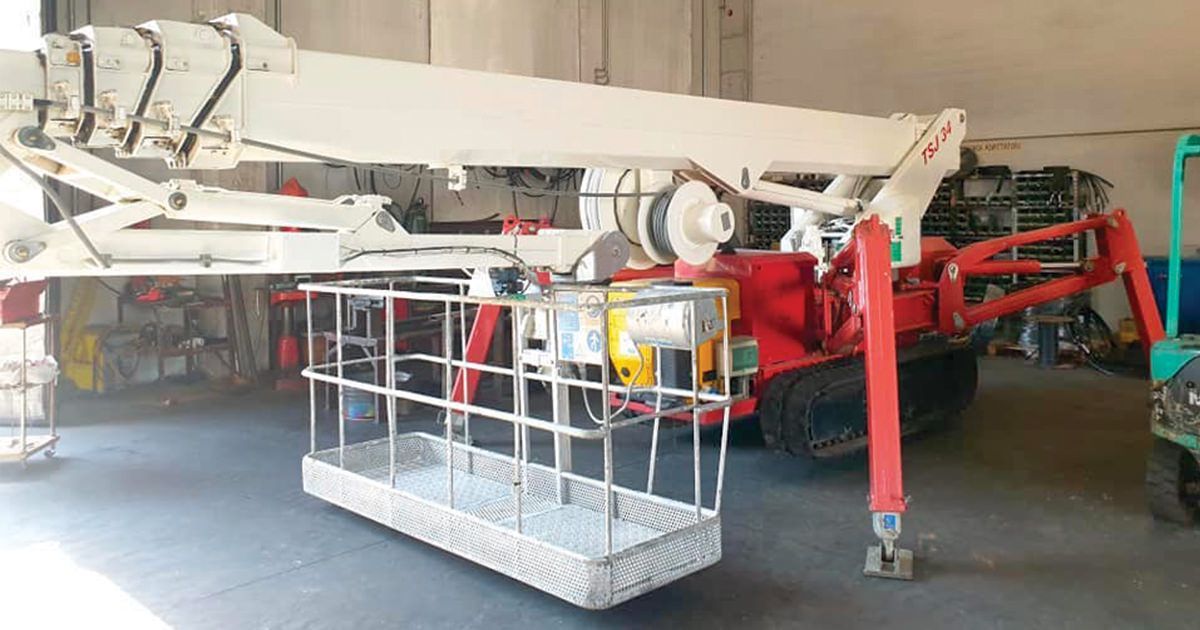 - Semoventi cingolate tipo Ragno con braccio telescopico e/o articolato, stabilizzatori idraulici articolati opportunamente piazzati per l'utilizzo della parte aerea con torretta girevole in grado di sbracciare a 360°, motore disel o bivalente per applicazioni esterne o interne.